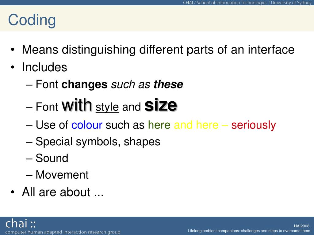 Coding Means distinguishing different parts of an interface Includes Font changessuch asthese Fontwithstyle and size Use of colour such as here and here – seriously Special symbols, shapes Sound Movement All are about ...