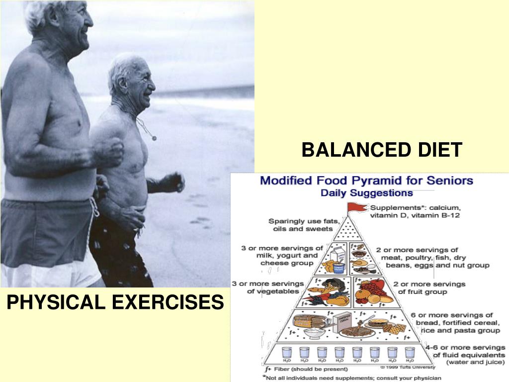 LIFE STYLES and ADL functioning 32 year-follow-up (1962-1994) of 1741 university alumni born between 1913 and 1925 3 “modifiable” risk factors PHYSICAL EXERCICES WEIGHT SMOKING DISABILITY was postponed by 10 y. VITA AJ et al New Engl J Med 1998; 338: 1035-41 High risk group Low risk group