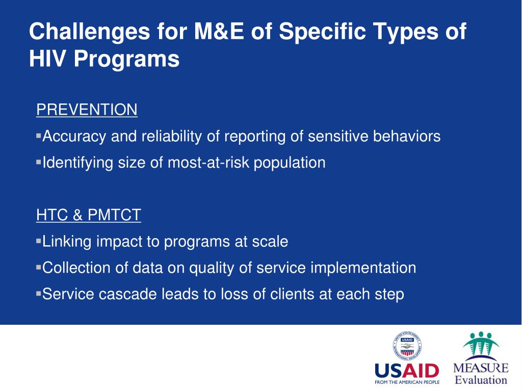 Challenges for M&E of Specific Types of HIV Programs PREVENTION • Accuracy and reliability of reporting of sensitive behaviors • Identifying size of most-at-risk population HTC & PMTCT • Linking impact to programs at scale • Collection of data on quality of service implementation • Service cascade leads to loss of clients at each step