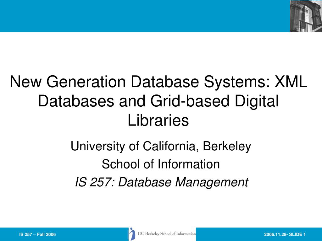 New Generation Database Systems: XML Databases and Grid-based Digital Libraries University of California, Berkeley School of Information IS 257: Database Management