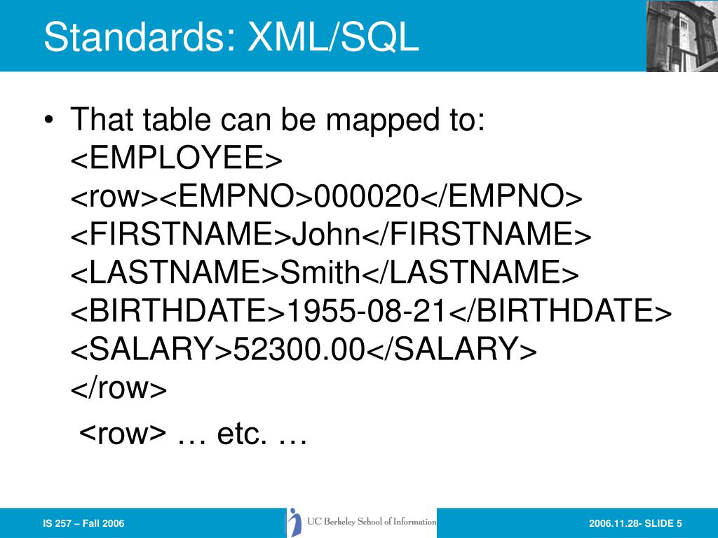 Standards: XML/SQL • That table can be mapped to: <EMPLOYEE> <row><EMPNO>000020</EMPNO> <FIRSTNAME>John</FIRSTNAME> <LASTNAME>Smith</LASTNAME> <BIRTHDATE>1955-08-21</BIRTHDATE> <SALARY>52300.00</SALARY> </row> <row> … etc. …