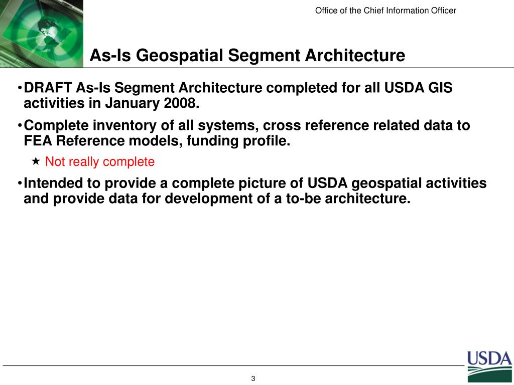 As-Is Geospatial Segment Architecture • DRAFT As-Is Segment Architecture completed for all USDA GIS activities in January 2008. • Complete inventory of all systems, cross reference related data to FEA Reference models, funding profile. • Not really complete • Intended to provide a complete picture of USDA geospatial activities and provide data for development of a to-be architecture.