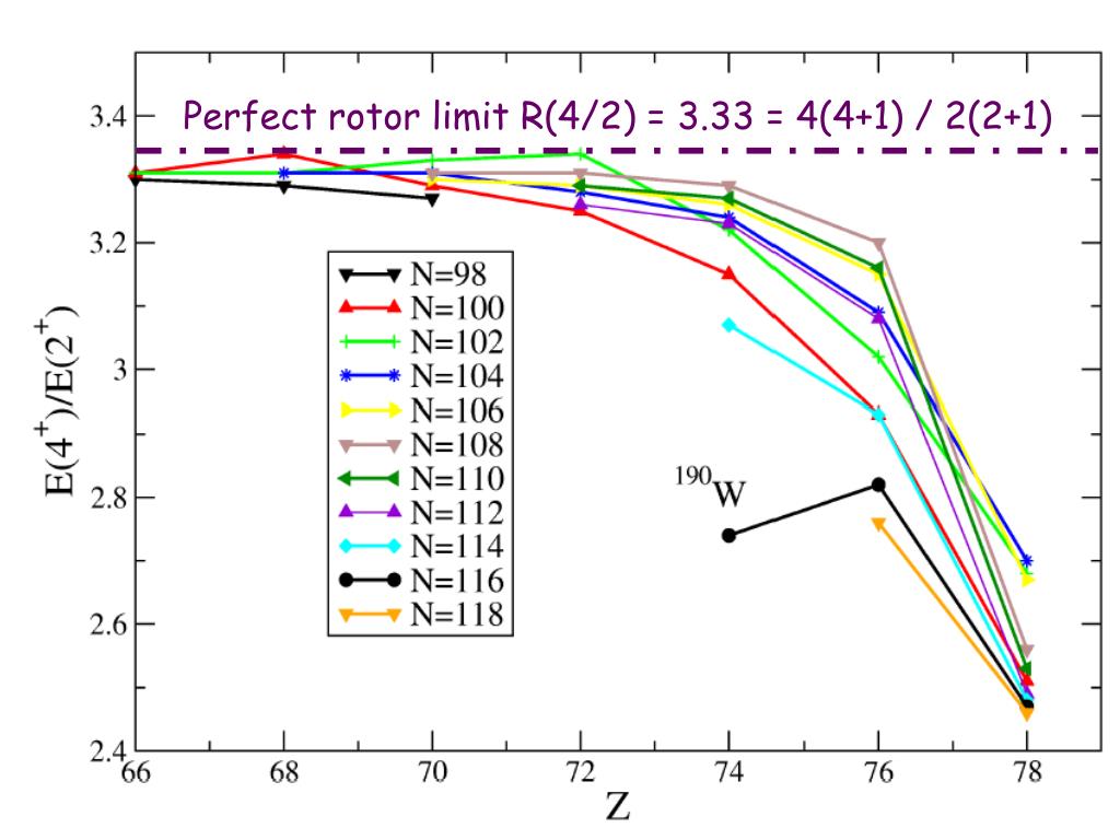 Lots of valence nucleons of both types:emergence of deformation and therefore rotation R4/2 ~3.33 = [4(4+1)] / [2(2+1)]