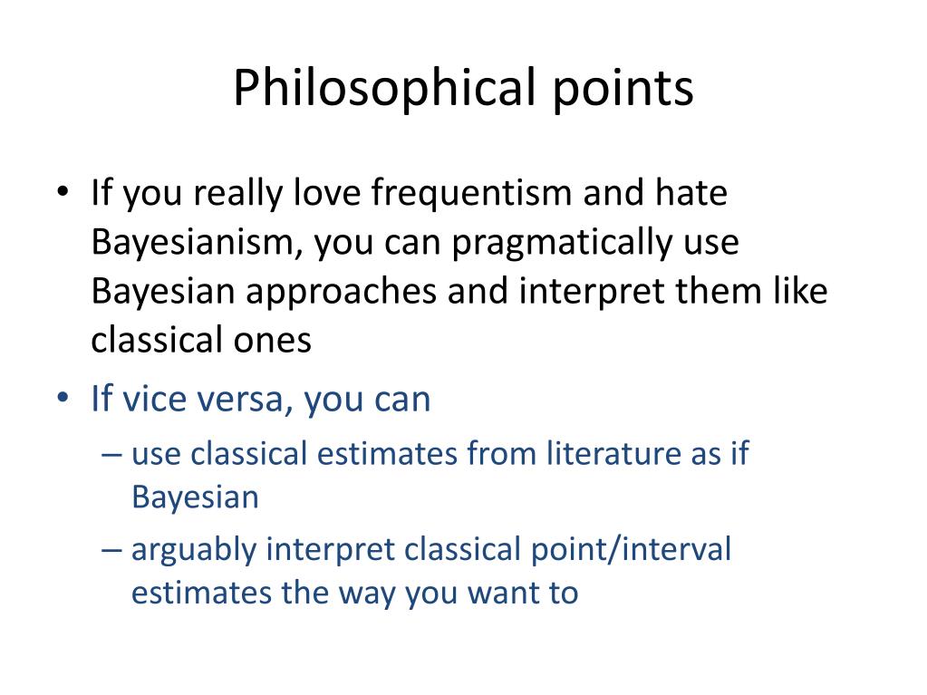Philosophical points • If you really love frequentism and hate Bayesianism, you can pragmatically use Bayesian approaches and interpret them like classical ones • If vice versa, you can • use classical estimates from literature as if Bayesian • arguably interpret classical point/interval estimates the way you want to