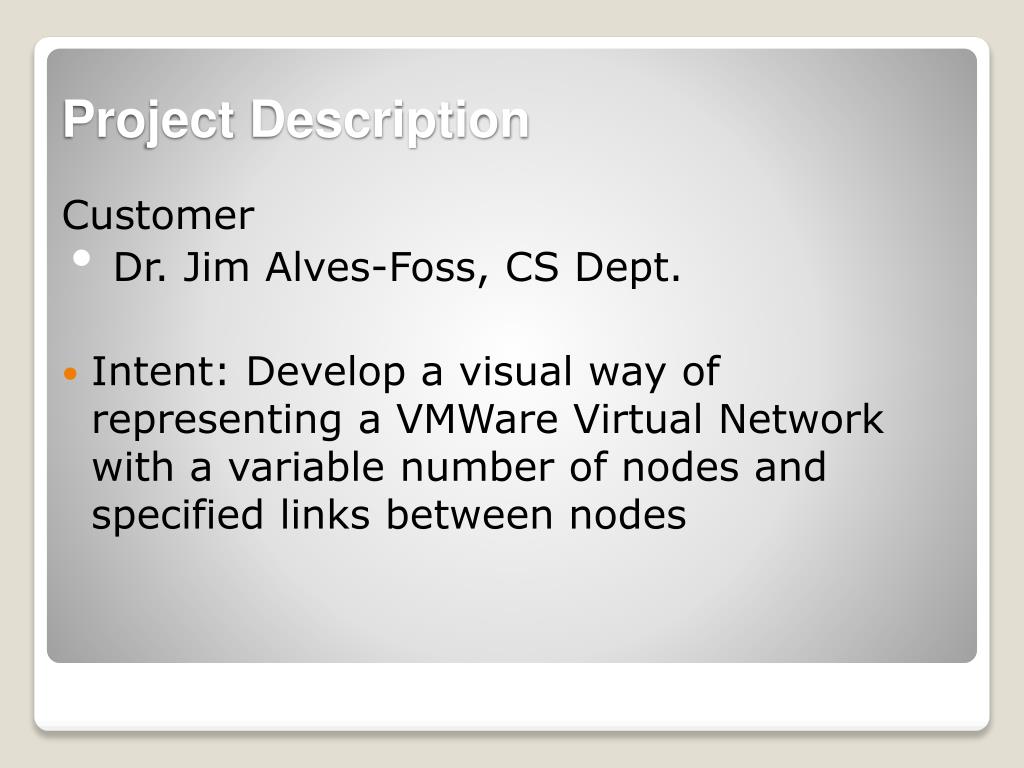 Project Description Customer • Dr. Jim Alves-Foss, CS Dept. • Intent: Develop a visual way of representing a VMWare Virtual Network with a variable number of nodes and specified links between nodes