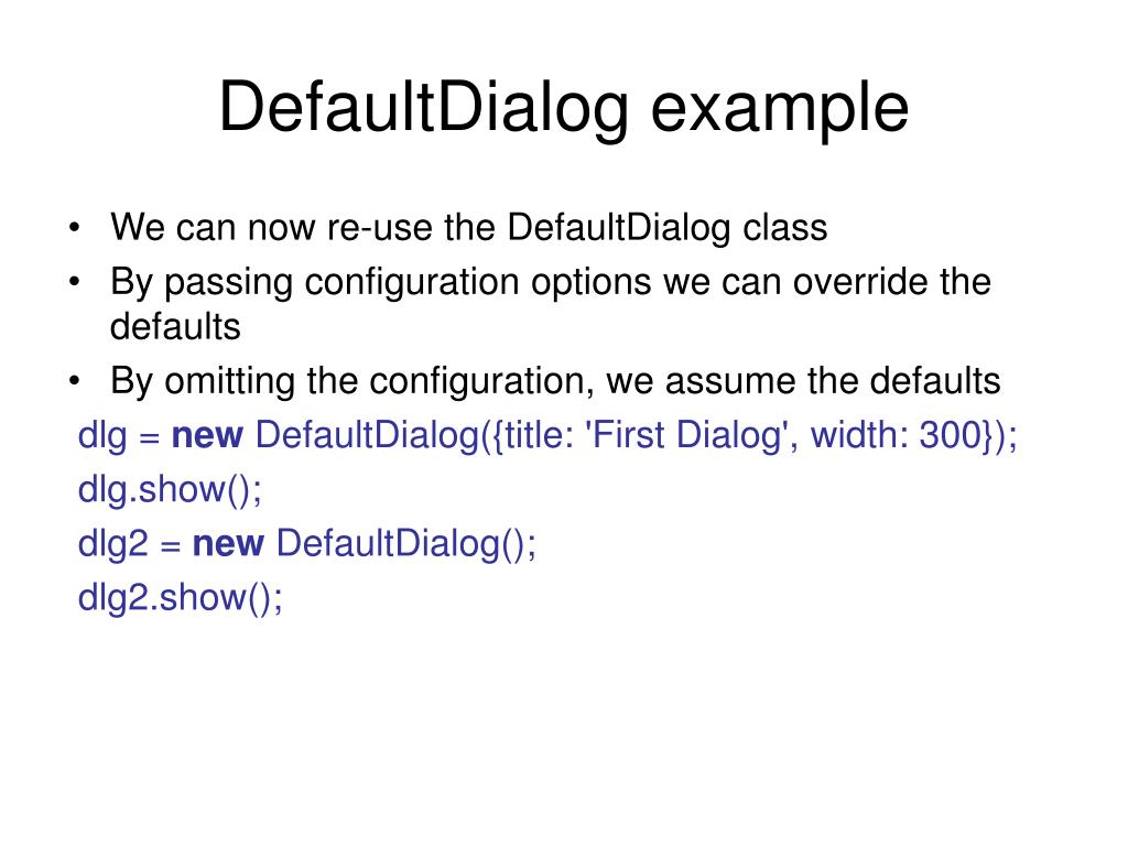 DefaultDialog example • We can now re-use the DefaultDialog class • By passing configuration options we can override the defaults • By omitting the configuration, we assume the defaults dlg = new DefaultDialog({title: 'First Dialog', width: 300}); dlg.show(); dlg2 = new DefaultDialog(); dlg2.show();