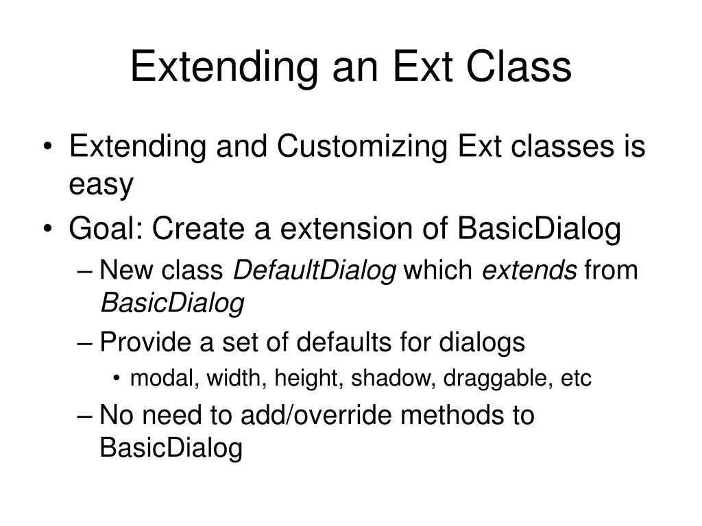 Extending an Ext Class • Extending and Customizing Ext classes is easy • Goal: Create a extension of BasicDialog • New class DefaultDialog which extends from BasicDialog • Provide a set of defaults for dialogs • modal, width, height, shadow, draggable, etc • No need to add/override methods to BasicDialog
