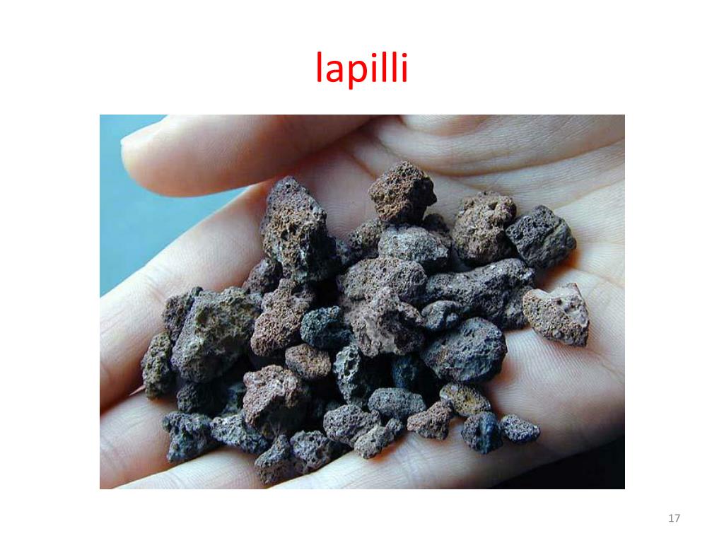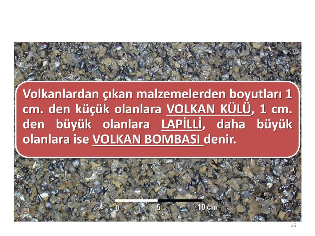 Volkanlardan çıkan malzemelerden boyutları 1 cm. den küçük olanlara VOLKAN KÜLÜ, 1 cm. den büyük olanlara LAPİLLİ, daha büyük olanlara ise VOLKAN BOMBASI denir.