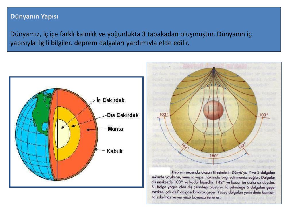 Dünyanın Yapısı Dünyamız, iç içe farklı kalınlık ve yoğunlukta 3 tabakadan oluşmuştur. Dünyanın iç yapısıyla ilgili bilgiler, deprem dalgaları yardımıyla elde edilir.