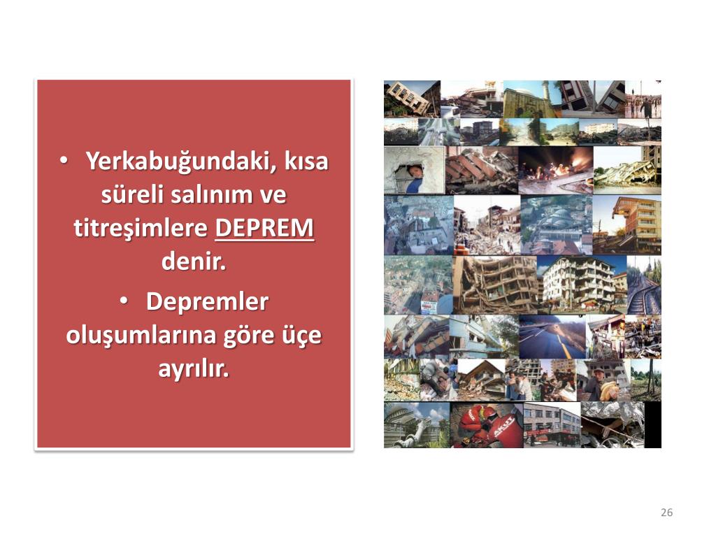 Yerkabuğundaki, kısa süreli salınım ve titreşimlere DEPREM denir. • Depremler oluşumlarına göre üçe ayrılır.