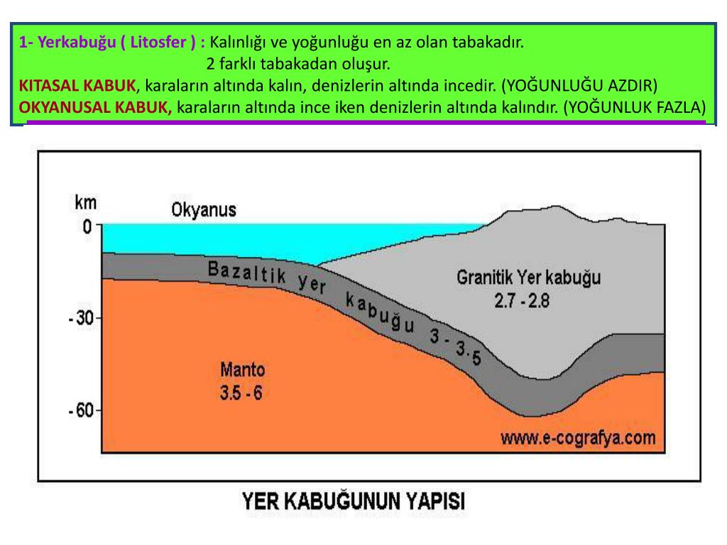 1- Yerkabuğu ( Litosfer ) : Kalınlığı ve yoğunluğu en az olan tabakadır. 2 farklı tabakadan oluşur. KITASAL KABUK, karaların altında kalın, denizlerin altında incedir. (YOĞUNLUĞU AZDIR) OKYANUSAL KABUK, karaların altında ince iken denizlerin altında kalındır. (YOĞUNLUK FAZLA)