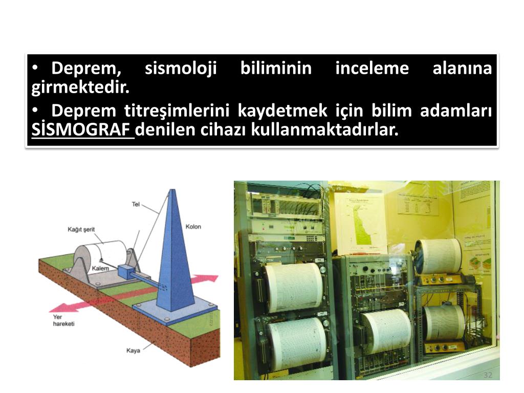 Deprem, sismoloji biliminin inceleme alanına girmektedir. • Deprem titreşimlerini kaydetmek için bilim adamları SİSMOGRAF denilen cihazı kullanmaktadırlar.