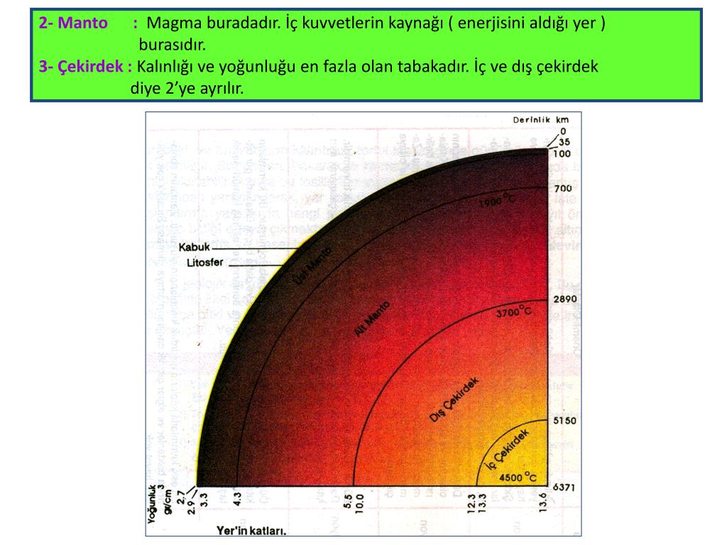 2- Manto : Magma buradadır. İç kuvvetlerin kaynağı ( enerjisini aldığı yer ) burasıdır. 3- Çekirdek : Kalınlığı ve yoğunluğuen fazla olan tabakadır. İç ve dış çekirdek diye 2’ye ayrılır.