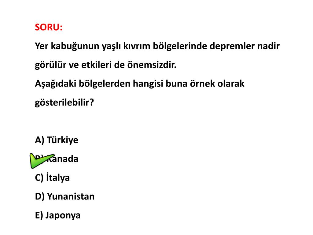 SORU: Yer kabuğunun yaşlı kıvrım bölgelerinde depremler nadir görülür ve etkileri de önemsizdir. Aşağıdaki bölgelerden hangisi buna örnek olarak gösterilebilir? A) Türkiye B) Kanada C) İtalya D) Yunanistan E) Japonya