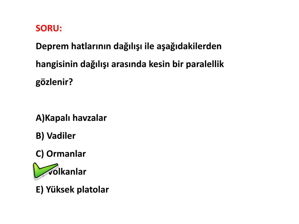 SORU: Deprem hatlarının dağılışı ile aşağıdakilerden hangisinin dağılışı arasında kesin bir paralellik gözlenir? A)Kapalı havzalar B) Vadiler C) Ormanlar D) Volkanlar E) Yüksek platolar