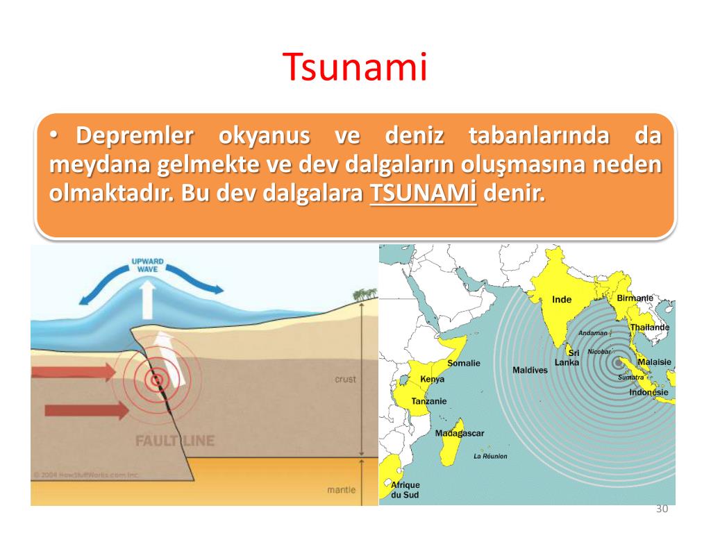 Tsunami • Depremler okyanus ve deniz tabanlarında da meydana gelmekte ve dev dalgaların oluşmasına neden olmaktadır. Bu dev dalgalara TSUNAMİ denir.