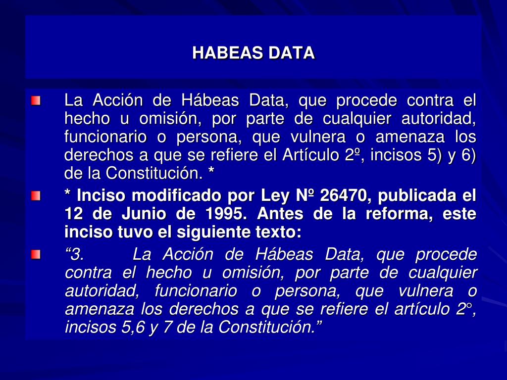 HABEAS DATA • La Acción de Hábeas Data, que procede contra el hecho u omisión, por parte de cualquier autoridad, funcionario o persona, que vulnera o amenaza los derechos a que se refiere el Artículo 2º, incisos 5) y 6) de la Constitución. * • * Inciso modificado por Ley Nº 26470, publicada el 12 de Junio de 1995. Antes de la reforma, este inciso tuvo el siguiente texto: • “3. La Acción de Hábeas Data, que procede contra el hecho u omisión, por parte de cualquier autoridad, funcionario o persona, que vulnera o amenaza los derechos a que se refiere el artículo 2°, incisos 5,6 y 7 de la Constitución.”