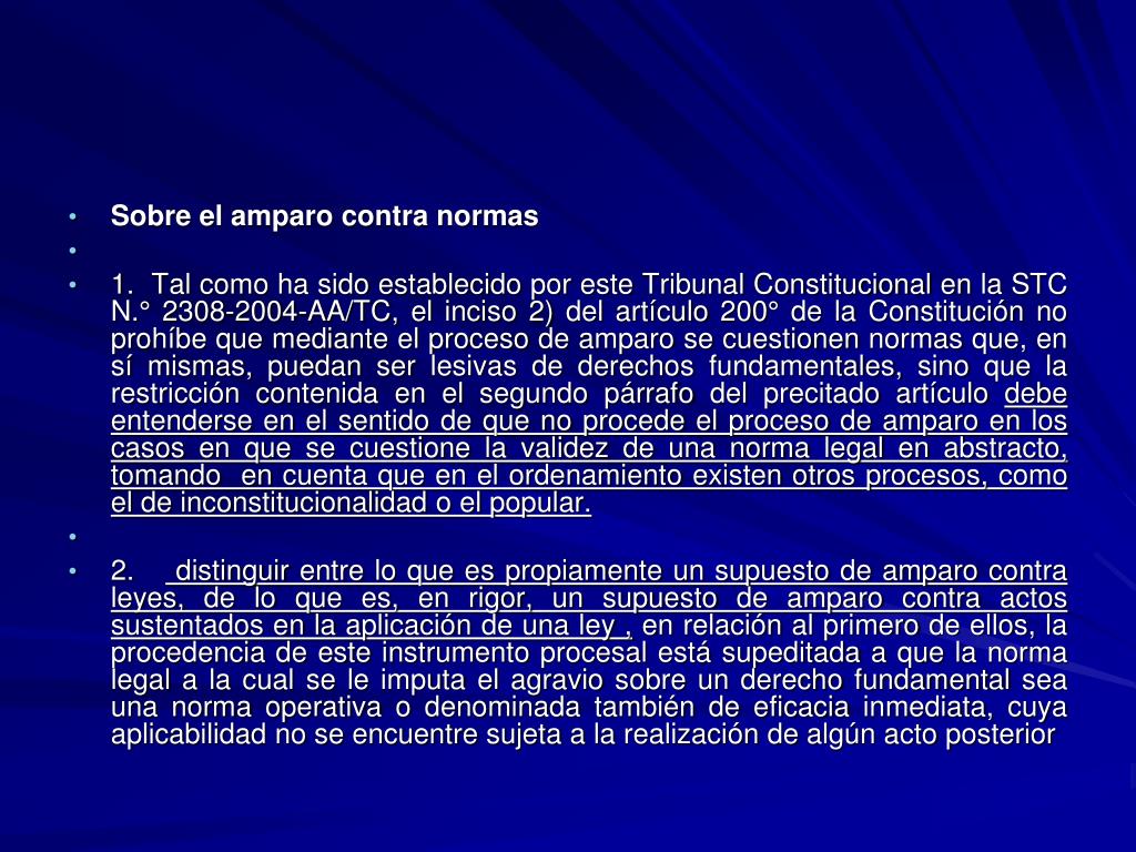 Sobre el amparo contra normas • 1. Tal como ha sido establecido por este Tribunal Constitucional en la STC N.° 2308-2004-AA/TC, el inciso 2) del artículo 200° de la Constitución no prohíbe que mediante el proceso de amparo se cuestionen normas que, en sí mismas, puedan ser lesivas de derechos fundamentales, sino que la restricción contenida en el segundo párrafo del precitado artículo debe entenderse en el sentido de que no procede el proceso de amparo en los casos en que se cuestione la validez de una norma legal en abstracto, tomando en cuenta que en el ordenamiento existen otros procesos, como el de inconstitucionalidad o el popular. • 2. distinguir entre lo que es propiamente un supuesto de amparo contra leyes, de lo que es, en rigor, un supuesto de amparo contra actos sustentados en la aplicación de una ley , en relación al primero de ellos, la procedencia de este instrumento procesal está supeditada a que la norma legal a la cual se le imputa el agravio sobre un derecho fundamental sea una norma operativa o denominada también de eficacia inmediata, cuya aplicabilidad no se encuentre sujeta a la realización de algún acto posterior