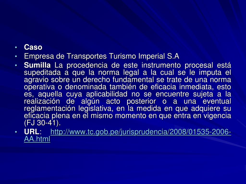Caso • Empresa de Transportes Turismo Imperial S.A • Sumilla La procedencia de este instrumento procesal está supeditada a que la norma legal a la cual se le imputa el agravio sobre un derecho fundamental se trate de una norma operativa o denominada también de eficacia inmediata, esto es, aquella cuya aplicabilidad no se encuentre sujeta a la realización de algún acto posterior o a una eventual reglamentación legislativa, en la medida en que adquiere su eficacia plena en el mismo momento en que entra en vigencia (FJ 30-41). • URL: http://www.tc.gob.pe/jurisprudencia/2008/01535-2006-AA.html