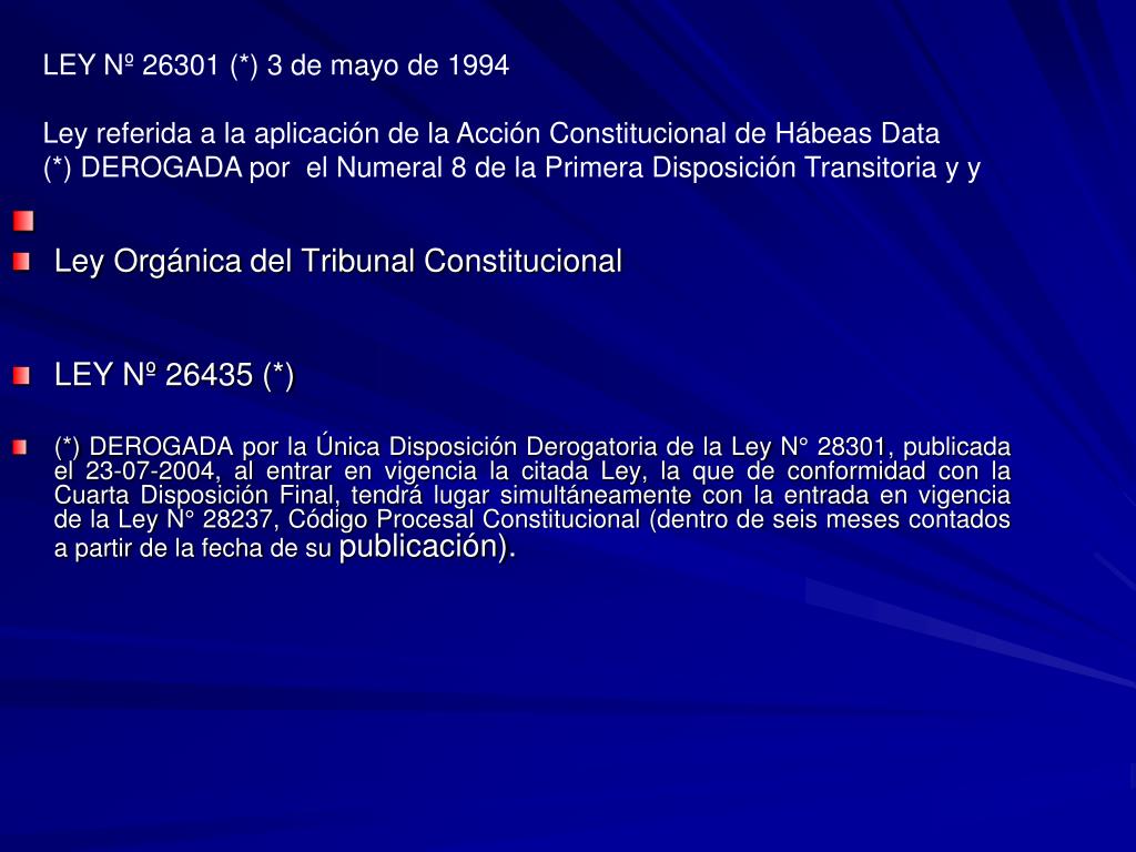 Ley Orgánica del Tribunal Constitucional LEY Nº 26435 (*) (*) DEROGADA por la Única Disposición Derogatoria de la Ley N° 28301, publicada el 23-07-2004, al entrar en vigencia la citada Ley, la que de conformidad con la Cuarta Disposición Final, tendrá lugar simultáneamente con la entrada en vigencia de la Ley N° 28237, Código Procesal Constitucional (dentro de seis meses contados a partir de la fecha de su publicación). LEY Nº 26301 (*) 3 de mayo de 1994 Ley referida a la aplicación de la Acción Constitucional de Hábeas Data (*) DEROGADA por el Numeral 8 de la Primera Disposición Transitoria y y