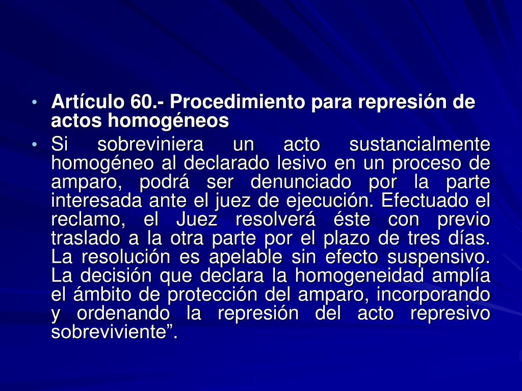 Artículo 60.- Procedimiento para represión de actos homogéneos • Si sobreviniera un acto sustancialmente homogéneo al declarado lesivo en un proceso de amparo, podrá ser denunciado por la parte interesada ante el juez de ejecución. Efectuado el reclamo, el Juez resolverá éste con previo traslado a la otra parte por el plazo de tres días. La resolución es apelable sin efecto suspensivo. La decisión que declara la homogeneidad amplía el ámbito de protección del amparo, incorporando y ordenando la represión del acto represivo sobreviviente”.