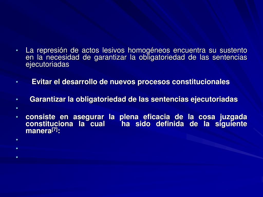 La represión de actos lesivos homogéneos encuentra su sustento en la necesidad de garantizar la obligatoriedad de las sentencias ejecutoriadas • Evitar el desarrollo de nuevos procesos constitucionales • Garantizar la obligatoriedad de las sentencias ejecutoriadas • consiste en asegurar la plena eficacia de la cosa juzgada constituciona la cual ha sido definida de la siguiente manera[7]: