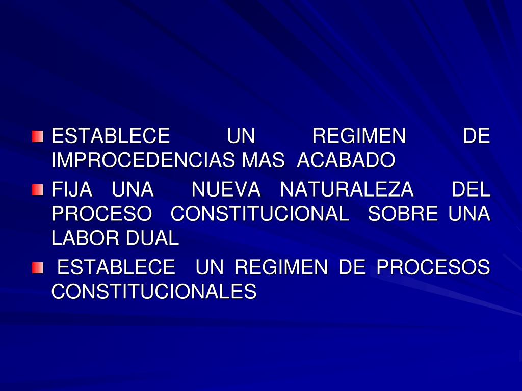 ESTABLECE UN REGIMEN DE IMPROCEDENCIAS MAS ACABADO • FIJA UNA NUEVA NATURALEZA DEL PROCESO CONSTITUCIONAL SOBRE UNA LABOR DUAL • ESTABLECE UN REGIMEN DE PROCESOS CONSTITUCIONALES