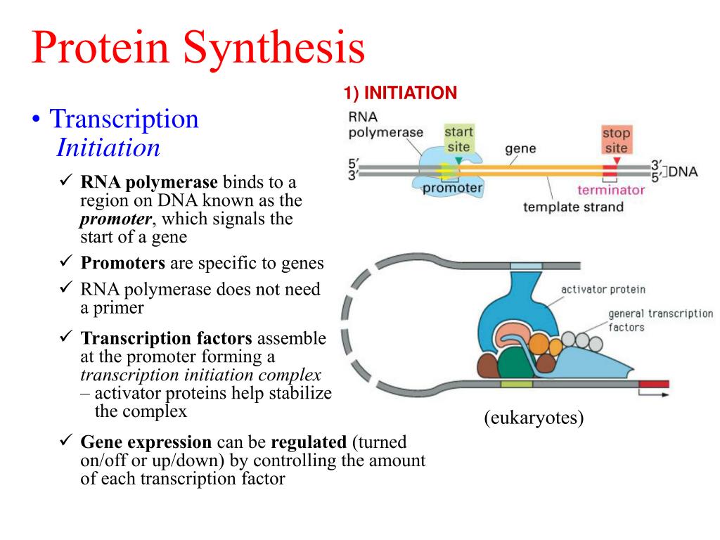 Protein Synthesis 1) INITIATION (eukaryotes) • TranscriptionInitiation • RNA polymerase binds to a region on DNA known as the promoter, which signals the start of a gene • Promoters are specific to genes • RNA polymerase does not need a primer • Transcription factors assemble at the promoter forming a transcription initiation complex– activator proteins help stabilize the complex • Gene expression can be regulated (turned on/off or up/down) by controlling the amount of each transcription factor