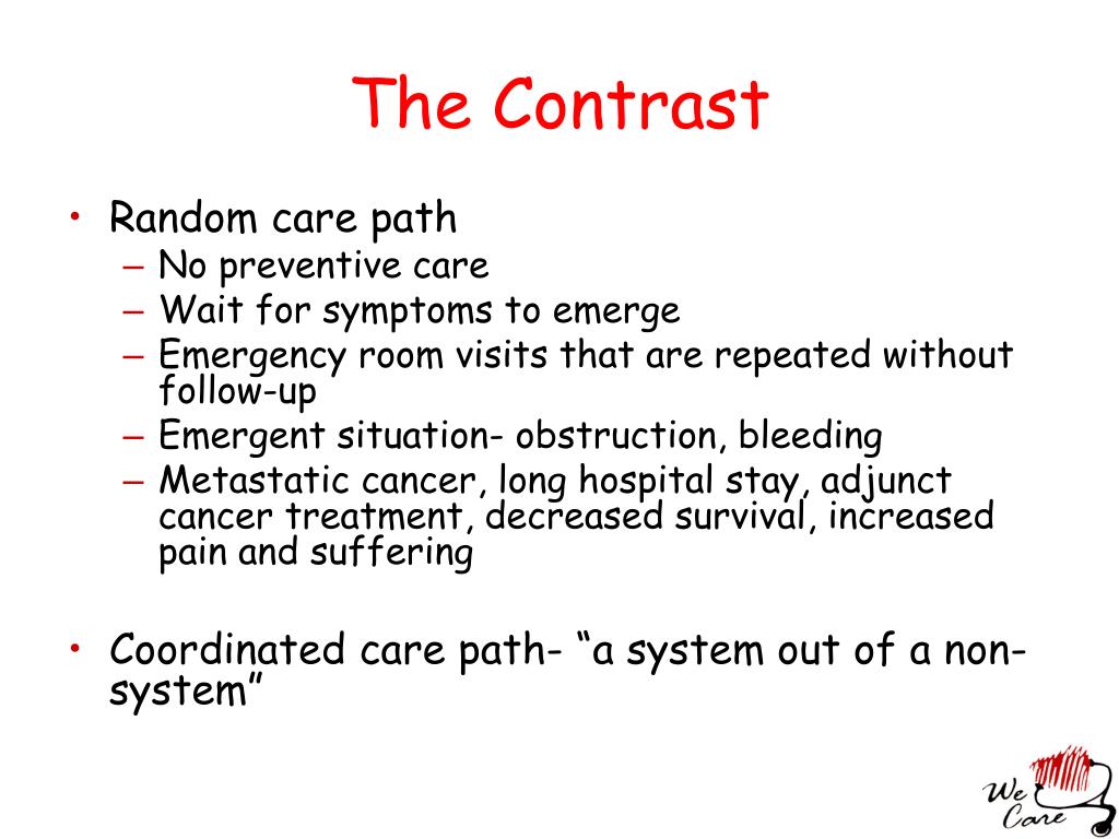 The Contrast • Random care path • No preventive care • Wait for symptoms to emerge • Emergency room visits that are repeated without follow-up • Emergent situation- obstruction, bleeding • Metastatic cancer, long hospital stay, adjunct cancer treatment, decreased survival, increased pain and suffering • Coordinated care path- “a system out of a non-system”