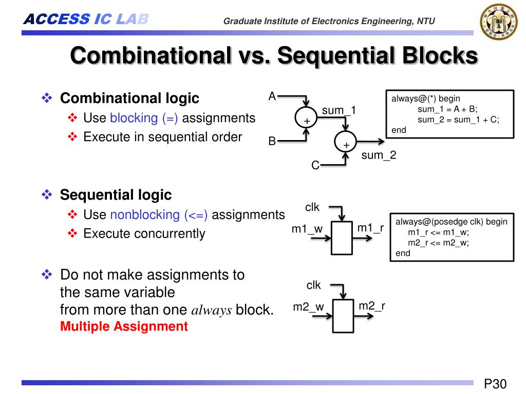 Combinational vs. Sequential Blocks A • always@(*) begin • sum_1 = A + B; • sum_2 = sum_1 + C; • end • Combinational logic • Use blocking (=) assignments • Execute in sequential order • Sequential logic • Use nonblocking (<=) assignments • Execute concurrently • Do not make assignments to the same variable from more than one always block. Multiple Assignment sum_1 + B + sum_2 C clk always@(posedgeclk) begin m1_r <= m1_w; m2_r <= m2_w; end m1_r m1_w m2_r m2_w clk
