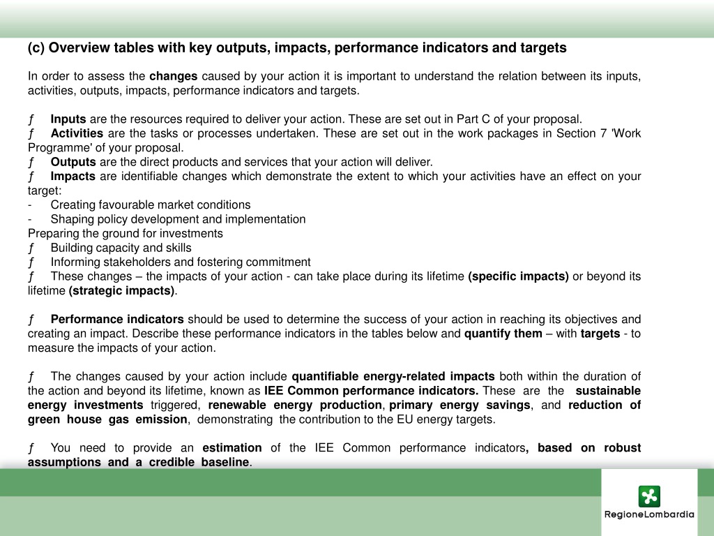 (c) Overview tables with key outputs, impacts, performance indicators and targets In order to assess the changes caused by your action it is important to understand the relation between its inputs, activities, outputs, impacts, performance indicators and targets. ƒ Inputs are the resources required to deliver your action. These are set out in Part C of your proposal. ƒ Activities are the tasks or processes undertaken. These are set out in the work packages in Section7 'Work Programme' of your proposal. ƒ Outputs are the direct products and services that your action will deliver. ƒ Impacts are identifiable changes which demonstrate the extent to which your activities have aneffect on your target: - Creating favourable market conditions -Shaping policy development and implementation Preparing the ground for investments ƒ Building capacity and skills ƒ Informing stakeholders and fostering commitment ƒ These changes – the impacts of your action - can take place during its lifetime (specific impacts)or beyond its lifetime (strategicimpacts). ƒ Performance indicators should be used to determine the success of your action in reaching its objectives and creating an impact. Describe these performance indicators in the tables below and quantify them – with targets - to measure the impacts of your action. ƒ The changes caused by your action include quantifiable energy-related impacts both within the duration of the actionand beyond its lifetime, known as IEE Common performance indicators. These are the sustainable energy investments triggered, renewable energy production, primary energy savings, and reduction of green house gas emission, demonstrating the contribution to the EU energy targets. ƒ You need to provide an estimation of the IEE Common performance indicators, based on robust assumptions and a credible baseline.