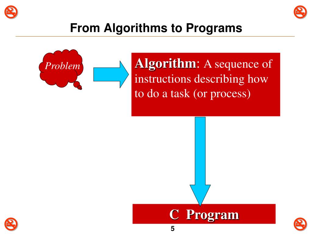 Algorithm: A sequence of instructions describing how to do a task (or process) Problem C Program From Algorithms to Programs