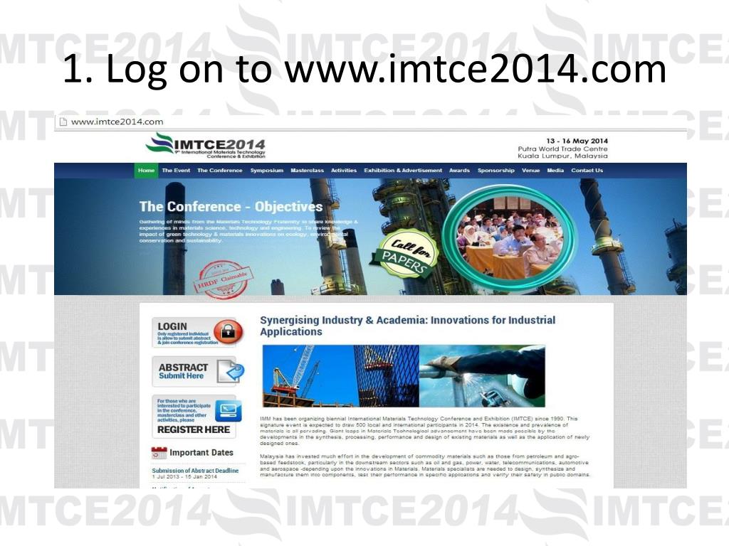How to Register and make Payment for IMTCE 2014. 1. Log on to www.imtce2014.com. 2. Please click on the Login/Register button to start signing up for an account. 3. For those that have an account, please log in and for those that have yet to sign up for an account, please do so.