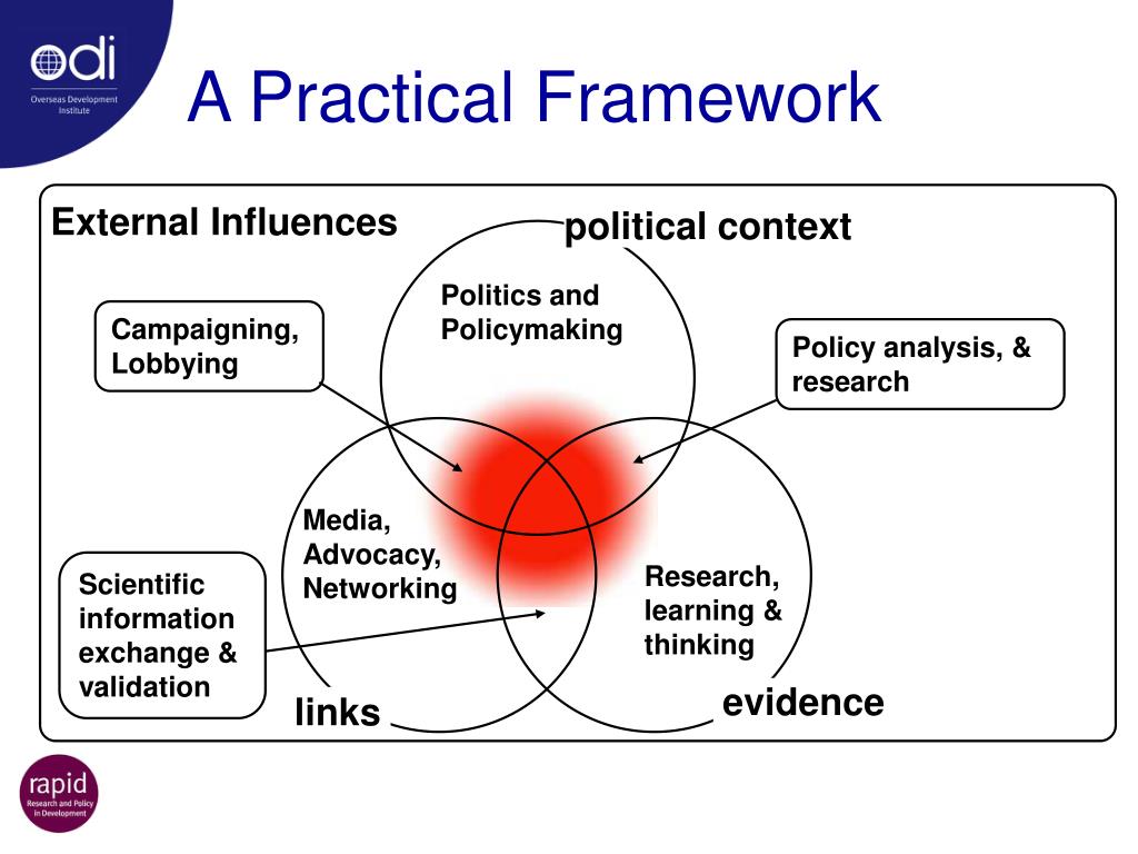 External Influences Campaigning, Lobbying Policy analysis, & research Scientific information exchange & validation A Practical Framework political context Politics and Policymaking Media, Advocacy, Networking Research, learning & thinking evidence links