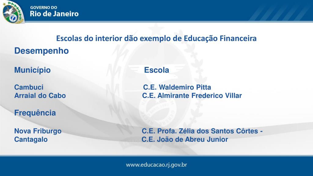 Escolas do interior dão exemplo de Educação Financeira Desempenho Município Escola Cambuci C.E. Waldemiro Pitta Arraial do Cabo C.E. Almirante Frederico Villar Frequência Nova Friburgo C.E. Profa. Zélia dos Santos Côrtes - Cantagalo C.E. João de Abreu Junior