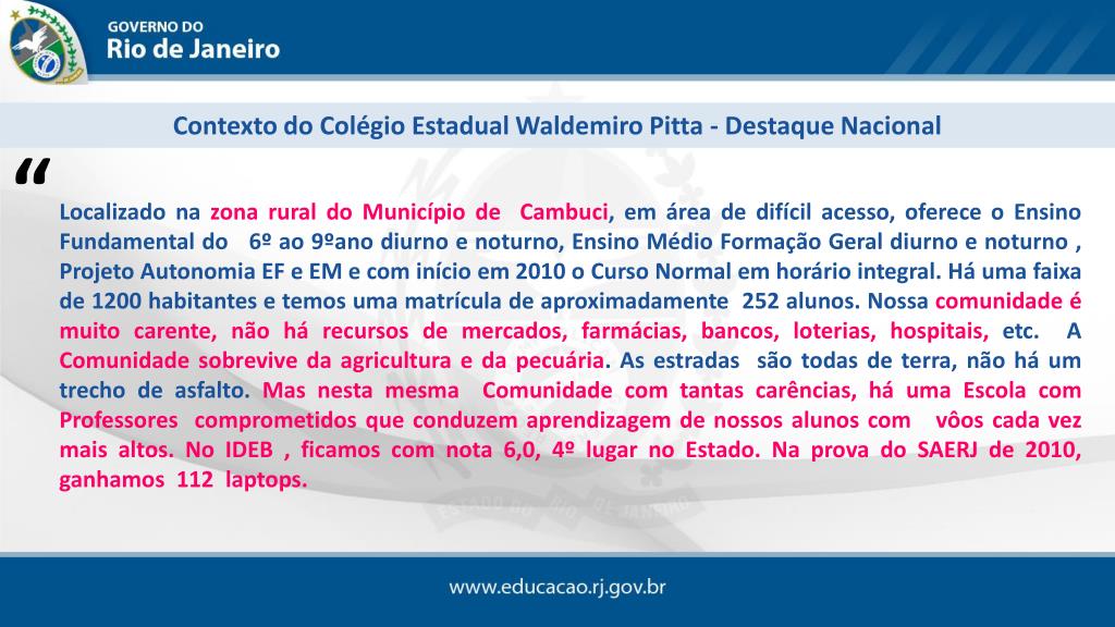 Contexto do Colégio Estadual Waldemiro Pitta - Destaque Nacional “ Localizado na zona rural do Município de Cambuci, em área de difícil acesso, oferece o Ensino Fundamental do 6º ao 9ºano diurno e noturno, Ensino Médio Formação Geral diurno e noturno , Projeto Autonomia EF e EM e com início em 2010 o Curso Normal em horário integral. Há uma faixa de 1200 habitantes e temos uma matrícula de aproximadamente 252 alunos. Nossa comunidade é muito carente, não há recursos de mercados, farmácias, bancos, loterias, hospitais, etc. A Comunidade sobrevive da agricultura e da pecuária. As estradas são todas de terra, não há um trecho de asfalto. Mas nesta mesma Comunidade com tantas carências, há uma Escola com Professores comprometidos que conduzem aprendizagem de nossos alunos com vôos cada vez mais altos. No IDEB , ficamos com nota 6,0, 4º lugar no Estado. Na prova do SAERJ de 2010, ganhamos 112 laptops.