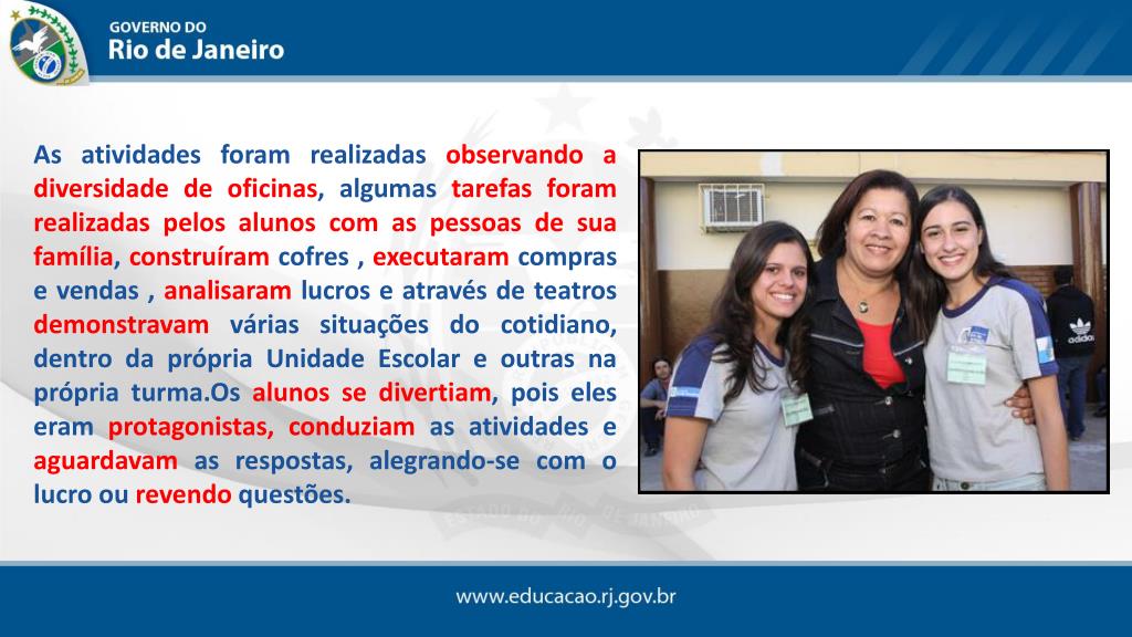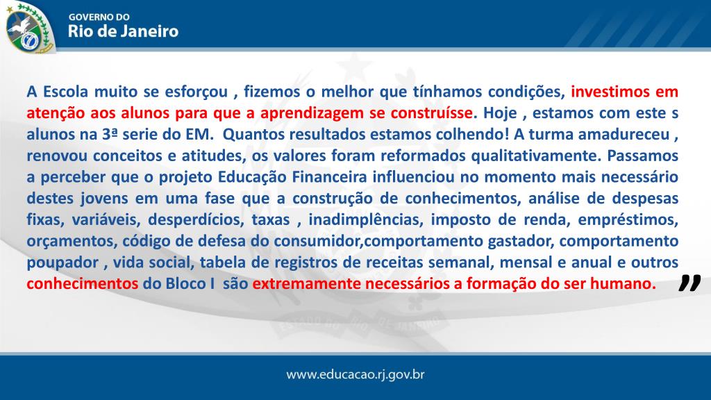 A Escola muito se esforçou , fizemos o melhor que tínhamos condições, investimos em atenção aos alunos para que a aprendizagem se construísse. Hoje , estamos com este s alunos na 3ª serie do EM. Quantos resultados estamos colhendo! A turma amadureceu , renovou conceitos e atitudes, os valores foram reformados qualitativamente. Passamos a perceber que o projeto Educação Financeira influenciou no momento mais necessário destes jovens em uma fase que a construção de conhecimentos, análise de despesas fixas, variáveis, desperdícios, taxas , inadimplências, imposto de renda, empréstimos, orçamentos, código de defesa do consumidor,comportamento gastador, comportamento poupador , vida social, tabela de registros de receitas semanal, mensal e anual e outros conhecimentos do Bloco I são extremamente necessários a formação do ser humano. ”