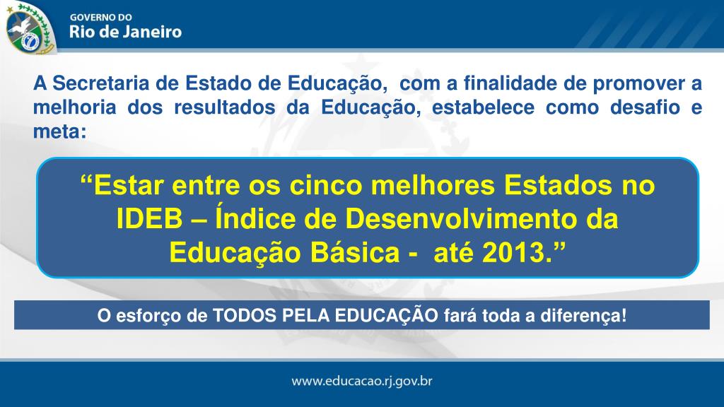A Secretaria de Estado de Educação, com a finalidade de promover a melhoria dos resultados da Educação, estabelece como desafio e meta: “Estar entre os cinco melhores Estados no IDEB – Índice de Desenvolvimento da Educação Básica - até 2013.” O esforço de TODOS PELA EDUCAÇÃO fará toda a diferença!