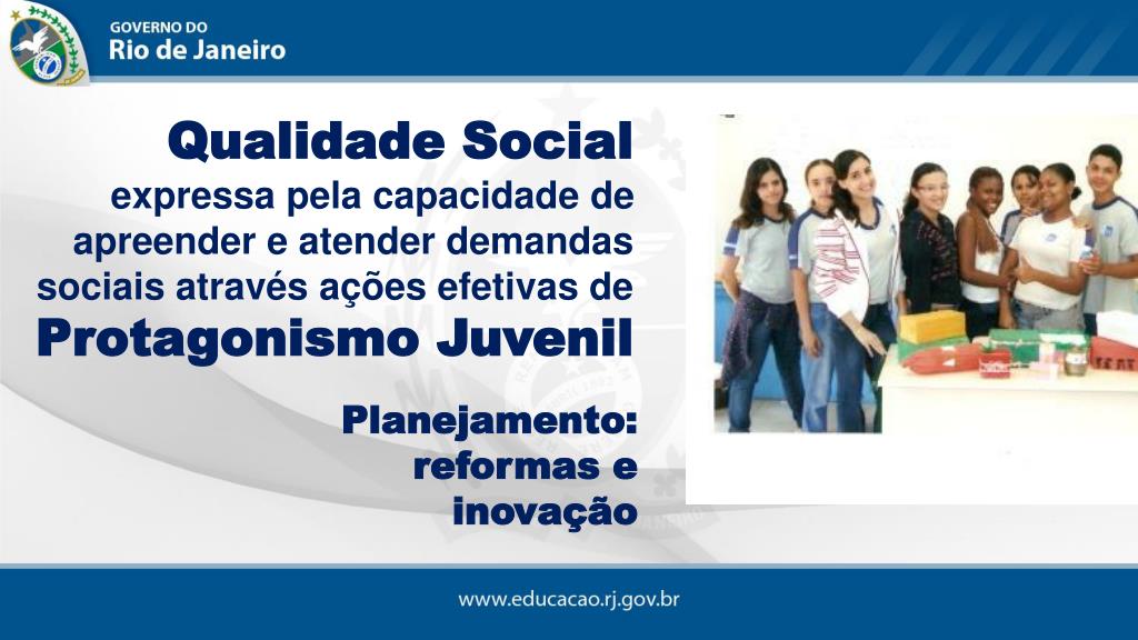 Qualidade Social expressa pela capacidade de apreender e atender demandas sociais através ações efetivas de Protagonismo Juvenil Planejamento: reformas e inovação