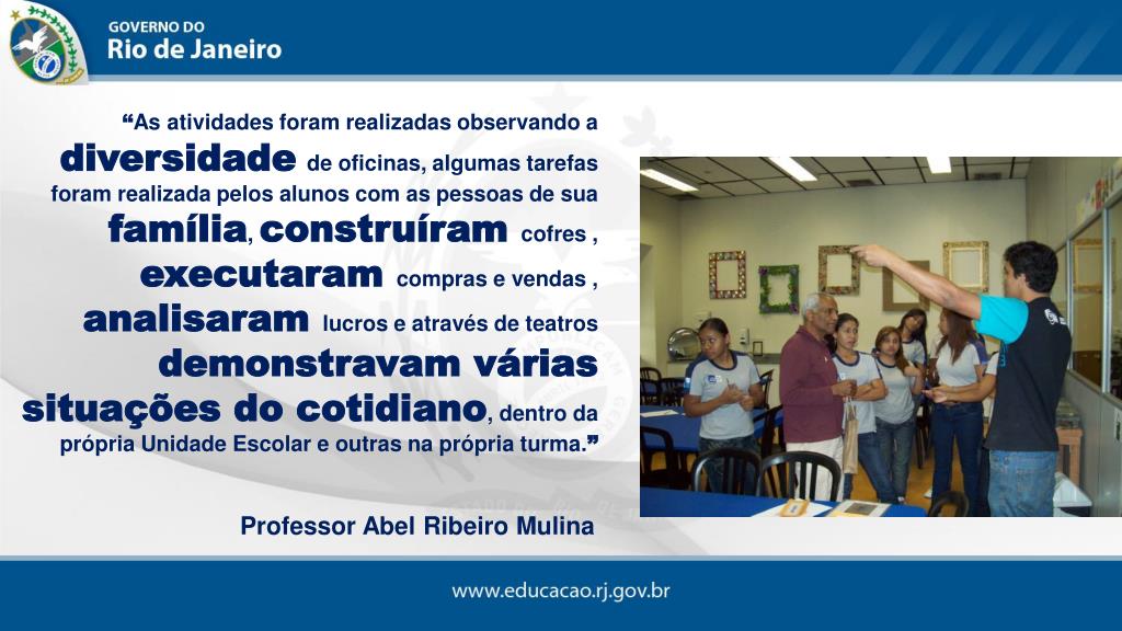 “As atividades foram realizadas observando a diversidadede oficinas, algumas tarefas foram realizada pelos alunos com as pessoas de sua família, construíram cofres , executaram compras e vendas , analisaram lucros e através de teatros demonstravam várias situações do cotidiano, dentro da própria Unidade Escolar e outras na própria turma.” Professor Abel Ribeiro Mulina