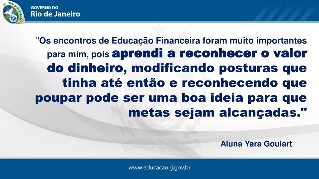 "Os encontros de Educação Financeira foram muito importantes para mim, pois aprendi a reconhecer o valor do dinheiro, modificando posturas que tinha até então e reconhecendo que poupar pode ser uma boa ideia para que metas sejam alcançadas." Aluna Yara Goulart
