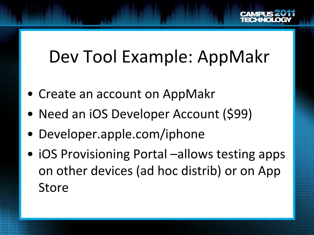 Dev Tool Example: AppMakr • Create an account on AppMakr • Need an iOS Developer Account ($99) • Developer.apple.com/iphone • iOS Provisioning Portal –allows testing apps on other devices (ad hoc distrib) or on App Store