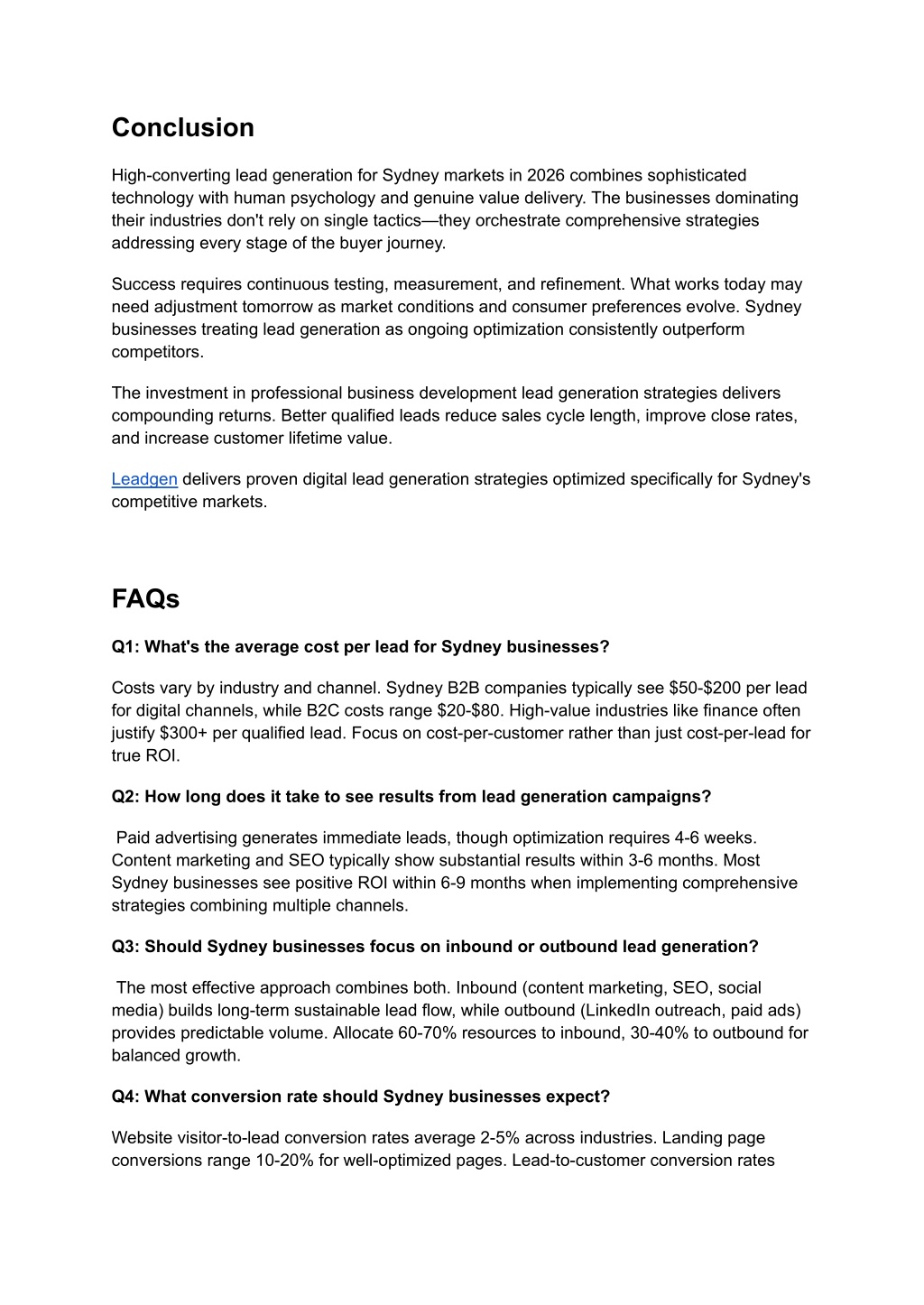 Conclusion High-converting lead generation for Sydney markets in 2026 combines sophisticated technology with human psychology and genuine value delivery. The businesses dominating their industries don't rely on single tactics—they orchestrate comprehensive strategies addressing every stage of the buyer journey. Success requires continuous testing, measurement, and refinement. What works today may need adjustment tomorrow as market conditions and consumer preferences evolve. Sydney businesses treating lead generation as ongoing optimization consistently outperform competitors. The investment in professional business development lead generation strategies delivers compounding returns. Better qualified leads reduce sales cycle length, improve close rates, and increase customer lifetime value. Leadgen delivers proven digital lead generation strategies optimized specifically for Sydney's competitive markets. FAQs Q1: What's the average cost per lead for Sydney businesses? Costs vary by industry and channel. Sydney B2B companies typically see $50-$200 per lead for digital channels, while B2C costs range $20-$80. High-value industries like finance often justify $300+ per qualified lead. Focus on cost-per-customer rather than just cost-per-lead for true ROI. Q2: How long does it take to see results from lead generation campaigns? Paid advertising generates immediate leads, though optimization requires 4-6 weeks. Content marketing and SEO typically show substantial results within 3-6 months. Most Sydney businesses see positive ROI within 6-9 months when implementing comprehensive strategies combining multiple channels. Q3: Should Sydney businesses focus on inbound or outbound lead generation? The most effective approach combines both. Inbound (content marketing, SEO, social media) builds long-term sustainable lead flow, while outbound (LinkedIn outreach, paid ads) provides predictable volume. Allocate 60-70% resources to inbound, 30-40% to outbound for balanced growth. Q4: What conversion rate should Sydney businesses expect? Website visitor-to-lead conversion rates average 2-5% across industries. Landing page conversions range 10-20% for well-optimized pages. Lead-to-customer conversion rates