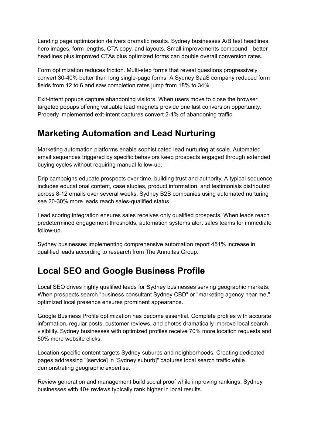 Landing page optimization delivers dramatic results. Sydney businesses A/B test headlines, hero images, form lengths, CTA copy, and layouts. Small improvements compound—better headlines plus improved CTAs plus optimized forms can double overall conversion rates. Form optimization reduces friction. Multi-step forms that reveal questions progressively convert 30-40% better than long single-page forms. A Sydney SaaS company reduced form fields from 12 to 6 and saw completion rates jump from 18% to 34%. Exit-intent popups capture abandoning visitors. When users move to close the browser, targeted popups offering valuable lead magnets provide one last conversion opportunity. Properly implemented exit-intent captures convert 2-4% of abandoning traffic. Marketing Automation and Lead Nurturing Marketing automation platforms enable sophisticated lead nurturing at scale. Automated email sequences triggered by specific behaviors keep prospects engaged through extended buying cycles without requiring manual follow-up. Drip campaigns educate prospects over time, building trust and authority. A typical sequence includes educational content, case studies, product information, and testimonials distributed across 8-12 emails over several weeks. Sydney B2B companies using automated nurturing see 20-30% more leads reach sales-qualified status. Lead scoring integration ensures sales receives only qualified prospects. When leads reach predetermined engagement thresholds, automation systems alert sales teams for immediate follow-up. Sydney businesses implementing comprehensive automation report 451% increase in qualified leads according to research from The Annuitas Group. Local SEO and Google Business Profile Local SEO drives highly qualified leads for Sydney businesses serving geographic markets. When prospects search "business consultant Sydney CBD" or "marketing agency near me," optimized local presence ensures prominent appearance. Google Business Profile optimization has become essential. Complete profiles with accurate information, regular posts, customer reviews, and photos dramatically improve local search visibility. Sydney businesses with optimized profiles receive 70% more location requests and 50% more website clicks. Location-specific content targets Sydney suburbs and neighborhoods. Creating dedicated pages addressing "[service] in [Sydney suburb]" captures local search traffic while demonstrating geographic expertise. Review generation and management build social proof while improving rankings. Sydney businesses with 40+ reviews typically rank higher in local results.