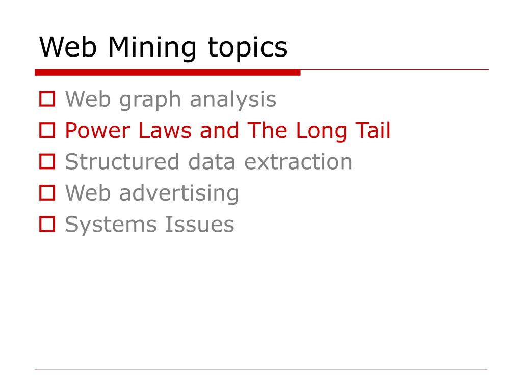 Web Mining topics • Web graph analysis • Power Laws and The Long Tail • Structured data extraction • Web advertising • Systems Issues