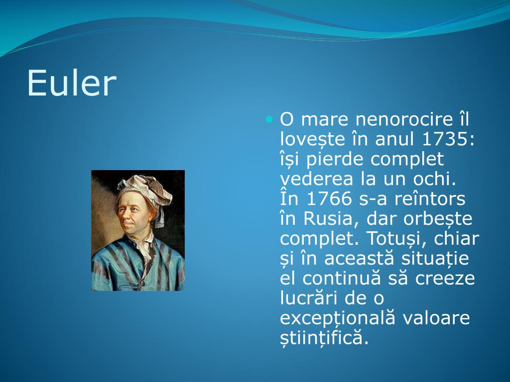 Euler • O mare nenorocire îl lovește în anul 1735: își pierde complet vederea la un ochi. În 1766 s-a reîntors în Rusia, dar orbește complet. Totuși, chiar și în această situație el continuă să creeze lucrări de o excepțională valoare științifică.