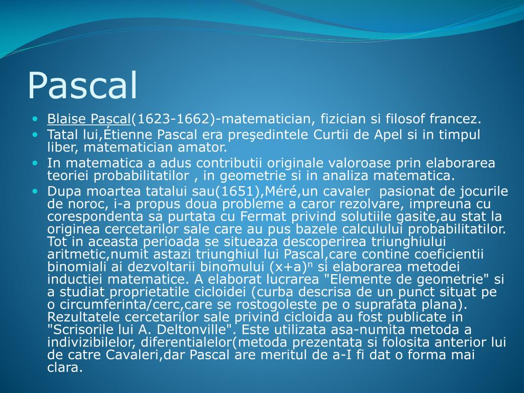 Pascal • Blaise Pascal(1623-1662)-matematician, fizician si filosof francez. • Tatal lui,Étienne Pascal era preşedintele Curtii de Apel si in timpul liber, matematician amator. • In matematica a adus contributii originale valoroase prin elaborarea teoriei probabilitatilor , in geometrie si in analiza matematica. • Dupa moartea tatalui sau(1651),Méré,un cavaler pasionat de jocurile de noroc, i-a propus doua probleme a caror rezolvare, impreuna cu corespondenta sa purtata cu Fermat privind solutiilegasite,au stat la originea cercetarilor sale care au pus bazele calculului probabilitatilor. Tot in aceasta perioada se situeaza descoperirea triunghiului aritmetic,numit astazi triunghiul lui Pascal,care continecoeficientii binomiali ai dezvoltarii binomului (x+a)n si elaborarea metodei inductiei matematice. A elaborat lucrarea "Elemente de geometrie" si a studiat proprietatile cicloidei (curba descrisa de un punct situat pe o circumferinta/cerc,care se rostogoleste pe o suprafata plana). Rezultatele cercetarilor sale privind cicloida au fost publicate in "Scrisorile lui A. Deltonville". Este utilizata asa-numita metoda a indivizibilelor, diferentialelor(metoda prezentata si folosita anterior lui de catre Cavaleri,dar Pascal are meritul de a-I fi dat o forma mai clara.