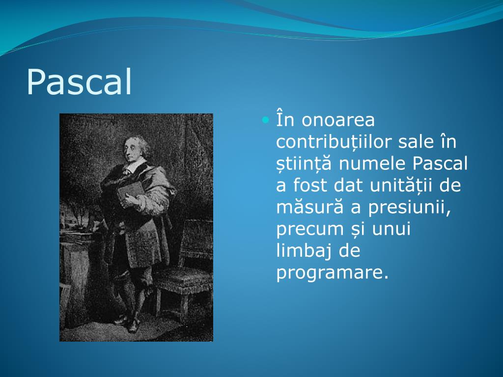 Pascal • În onoarea contribuțiilor sale în știință numele Pascal a fost dat unității de măsură a presiunii, precum și unui limbaj de programare.
