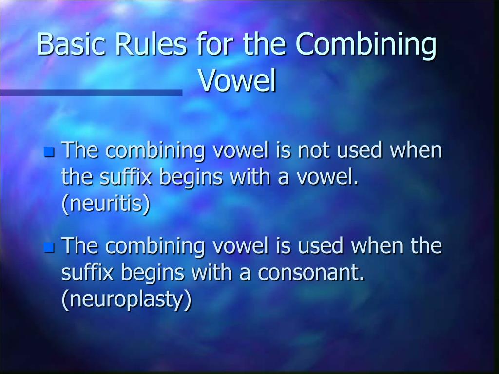 Basic Rules for the Combining Vowel • The combining vowel is not used when the suffix begins with a vowel. (neuritis) • The combining vowel is used when the suffix begins with a consonant. (neuroplasty)