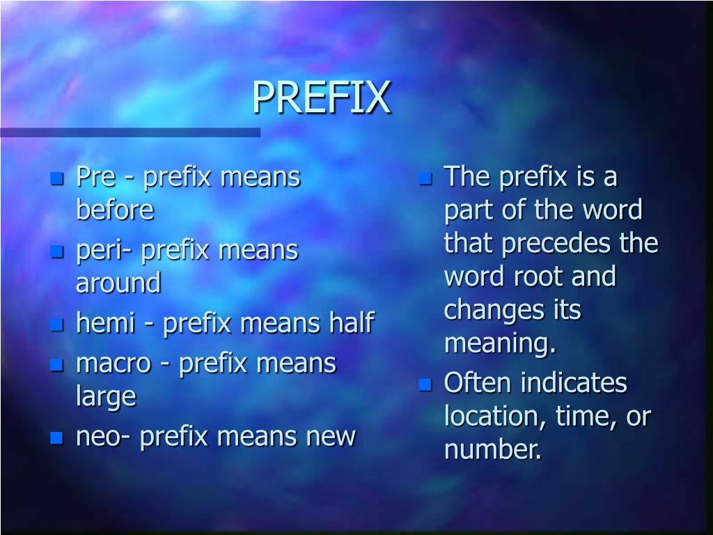 Pre - prefix means before peri- prefix means around hemi - prefix means half macro - prefix means large neo- prefix means new The prefix is a part of the word that precedes the word root and changes its meaning. Often indicates location, time, or number. PREFIX